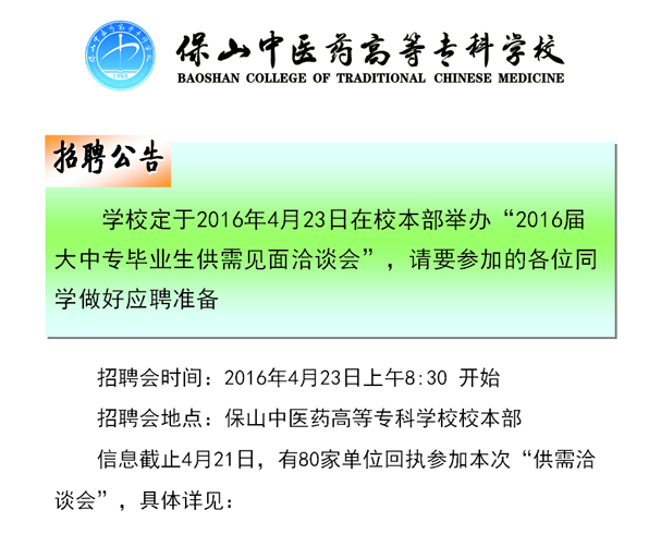保山中医药高等专科学校 2016届毕业生供需见面洽谈会邀请函 尊敬的用人单位: 感谢贵单位多年来对我校就...