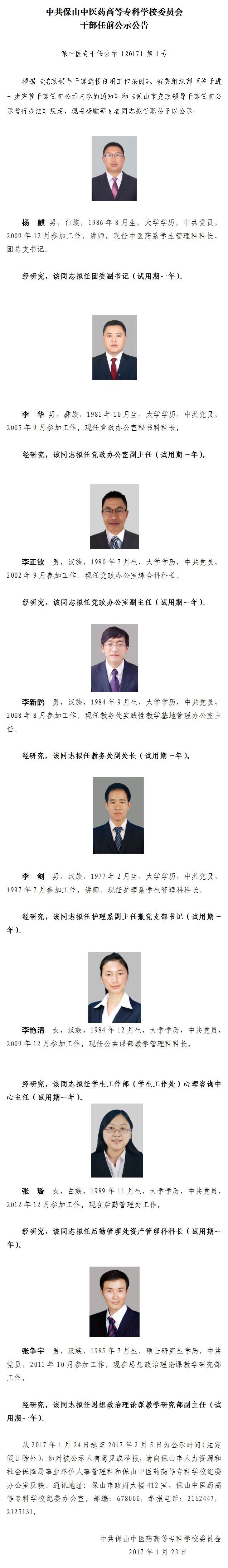 保中医专干任公示〔2017〕第1号公示