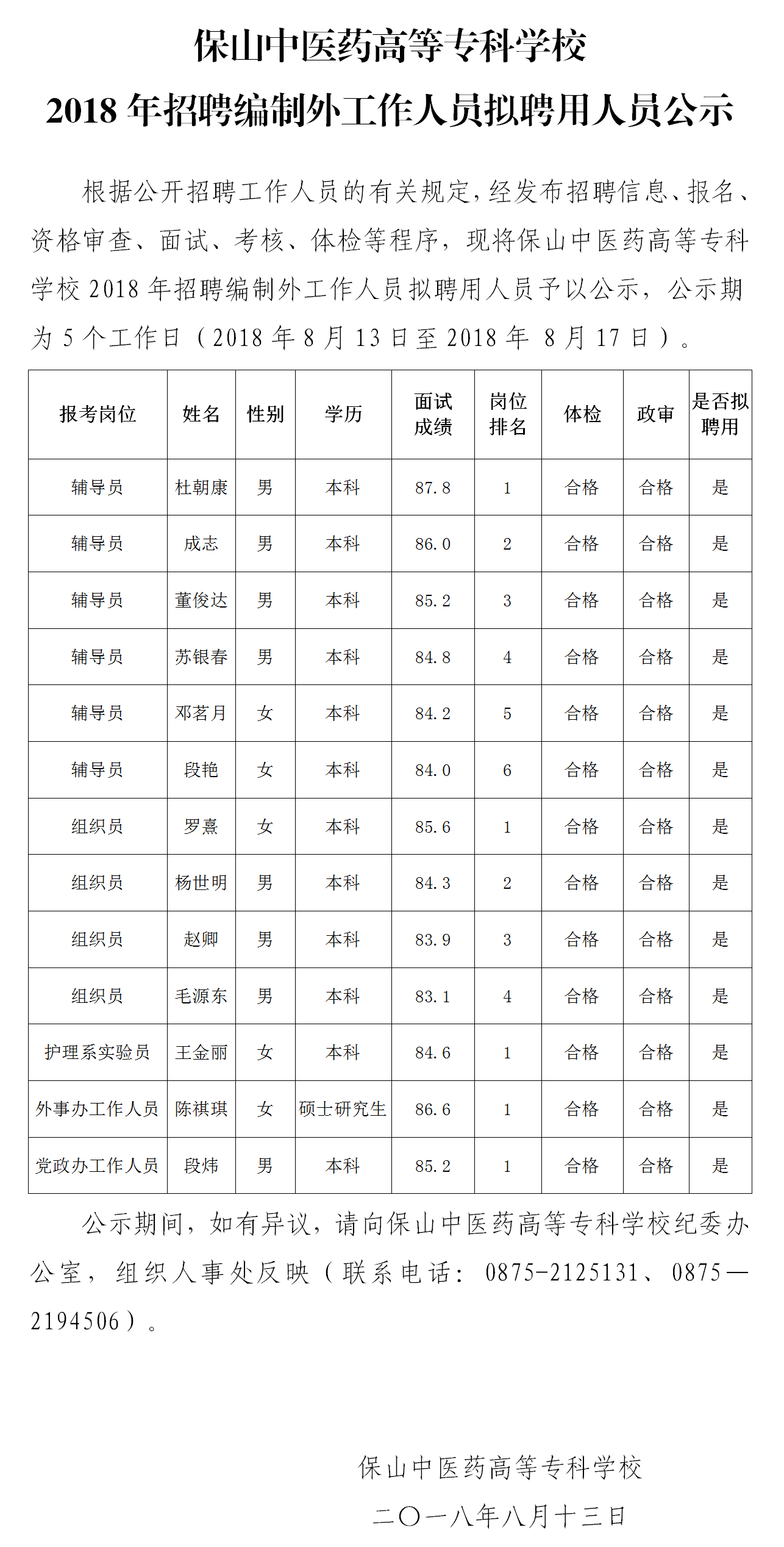 保山中医药高等专科学校 武装部关于下发定兵员名单公示 经隆阳区征兵领导小组2018年8月31日定兵会议研究...