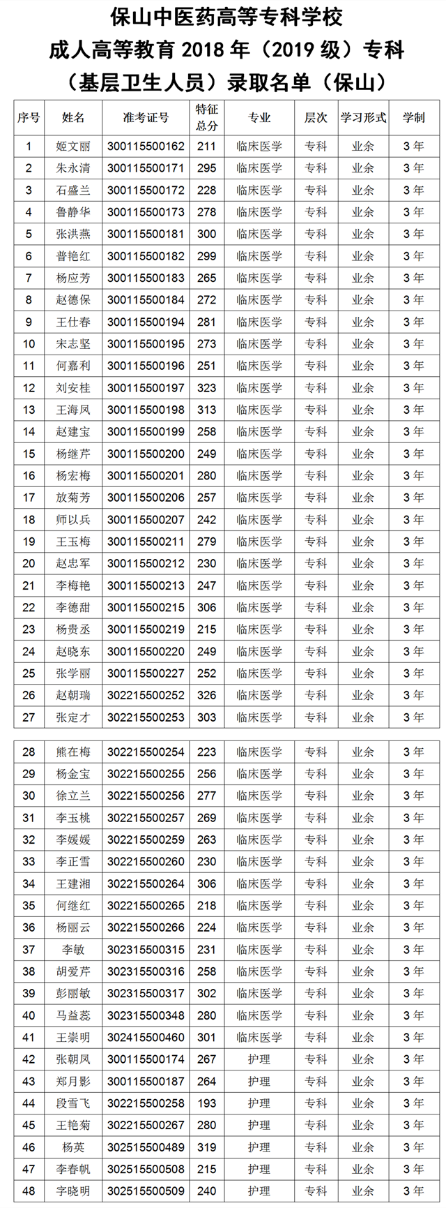 保山中医药高等专科学校2019级成人高等教育 专科(基层卫生人员)新生入学须知(保山) 首先,我们真诚...