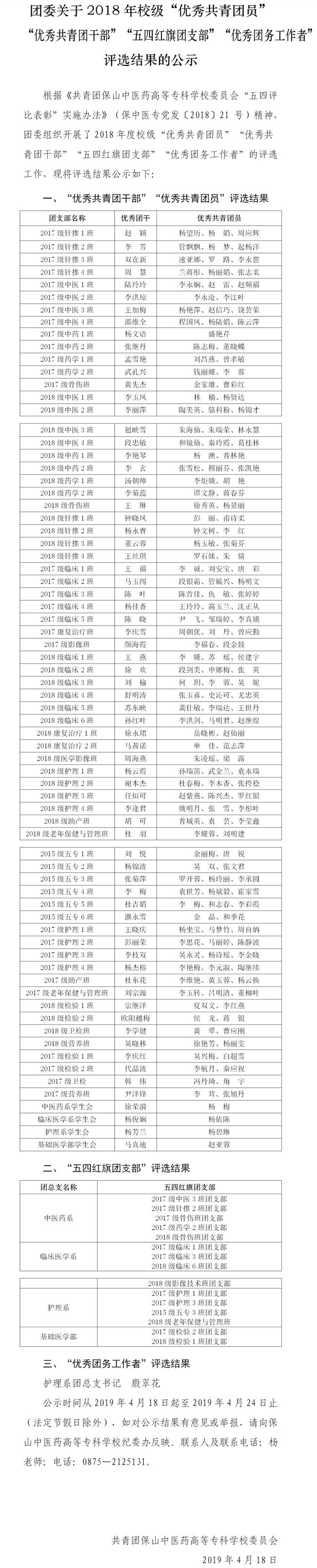 关于2018年度团总支考核结果及云南省优秀共青团员拟推荐人选...