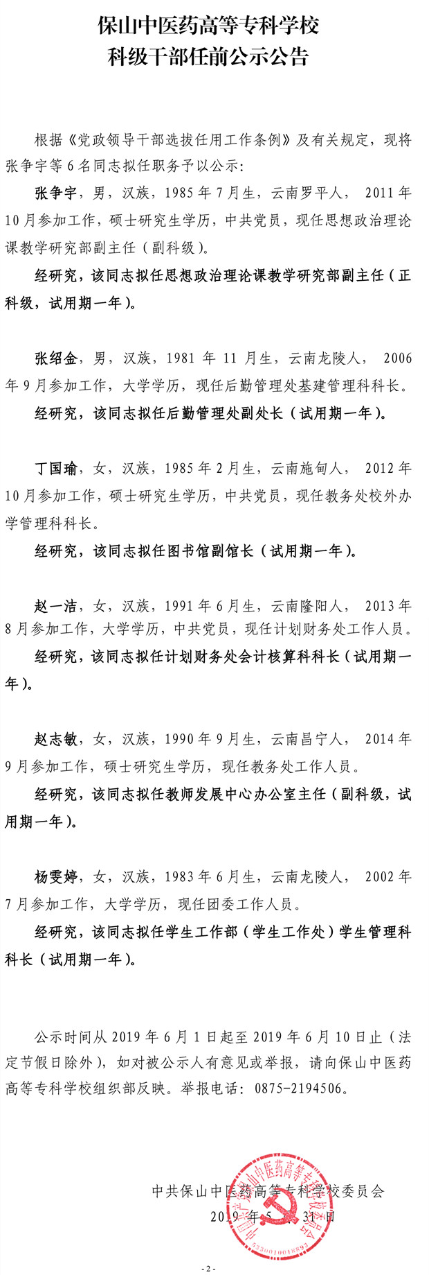 保山中医专科级干部任前公示公告