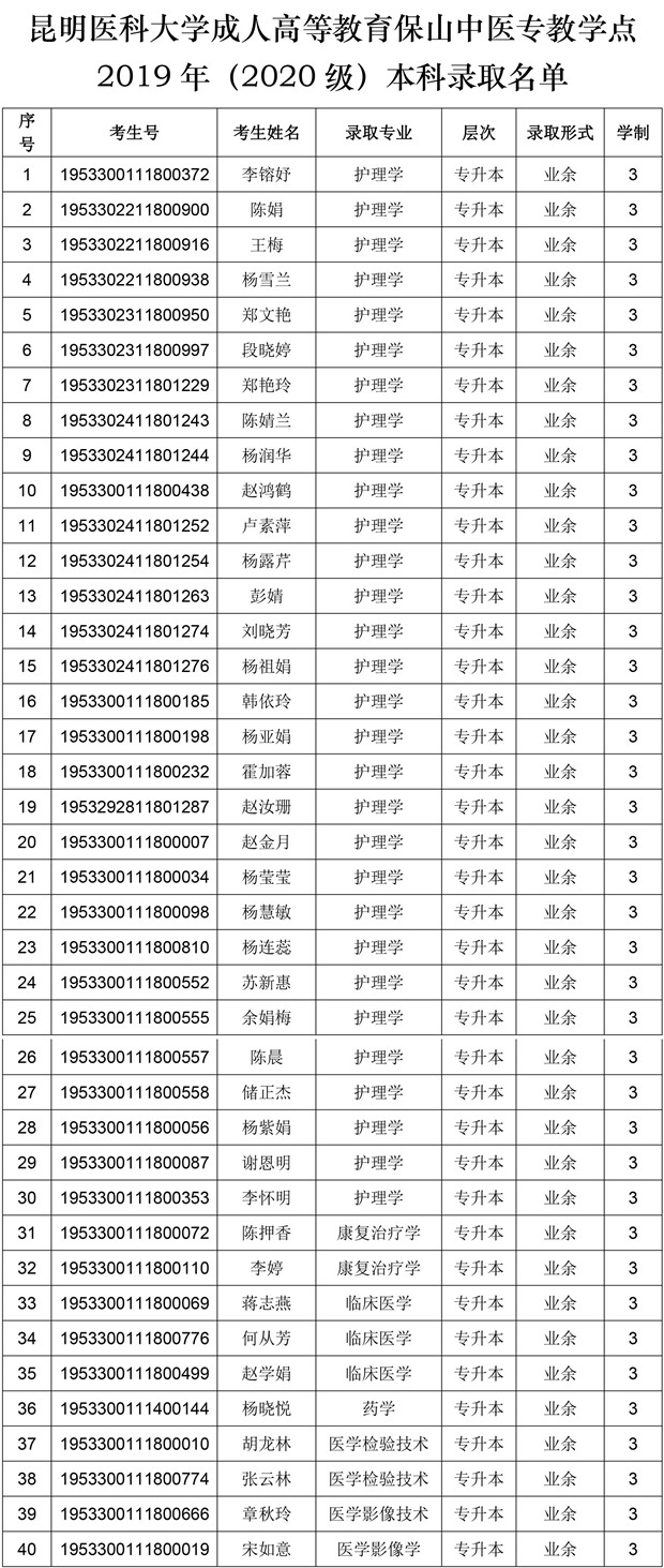 昆明医科大学保山中医药高等专科学校办学点2020级成人高等教...