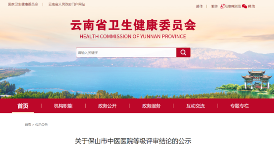 近日云南省卫生健康委员会发布了《关于保山市中医医院等级评审结论的公示》将保山市中医医院等级评审为...