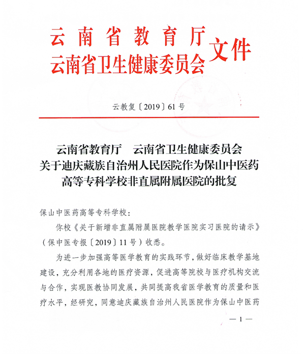 按照《云南省省教育厅卫生健康委员会关于迪庆藏族自治州人民医院作为保山中医药高等专科学校非直属附属医院的批复》(云教复[2019]61号)文件,同意迪庆藏族自治州人民医院新增为我校非直属附属医院。