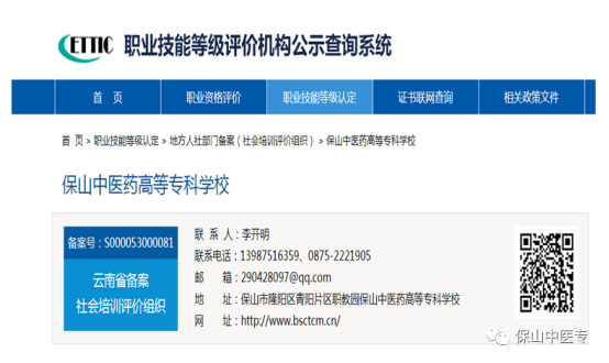 根据《云南省职业技能鉴定中心关于同意云南顺达职业培训学校等机构开展职业技能等级认定工作的函》精神,经机构申请、市人社部门初审,专家遴选、信用核查、综合评审等程序,保山中医专成为滇西片区唯一一家非技工类院校全日制公办职业技能等级评价机构,机构备案号:S000053000081。