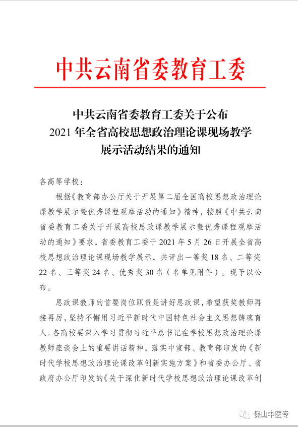 近日,省委教育工委公布了全省高校思想政治理论课现场教学展示活动获奖名单,保山中医专思政教师蒋龑在活动中荣获二等奖。