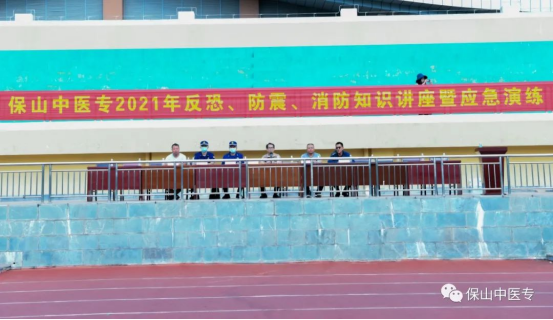 为深入贯彻落实习近平总书记在庆祝中国共产党成立100周年大会上的重要讲话精神,牢固树立总体国家安全观,提高学校师生员工应急处理能力,维护校园和谐稳定,7月14日上午,保山中医专举行2021年反恐、防震、消防知识讲座暨应急演练。