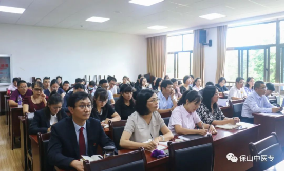 保山市卫健委范正建主任,保山市教育体育局职成教科穆虹羽科长,保山中医专第一附属医院、第二附属医院领导;学校党委副书记、校长殷建忠,党委委员、副校长李智辉,党委委员、副校长杨必超及教务处、科技处、中医学院(中药学院)负责人及相关工作人员线下参会;集团其他委员会成员线上参会。