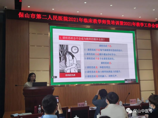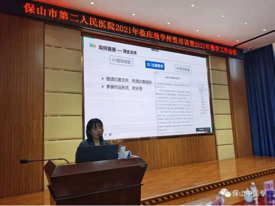 临床实践教学是医学人才培养的重要环节,临床实践教学教师的带教水平直接关系到人才培养质量。为进一步深化医教协同,推进双元育人机制构建,加强临床师资队伍建设,提升临床实践教学的带教能力,保山中医专第二附属医院(保山市第二人民医院)于11月5日召开“临床教学师资培训会暨2021年教学工作会议”。