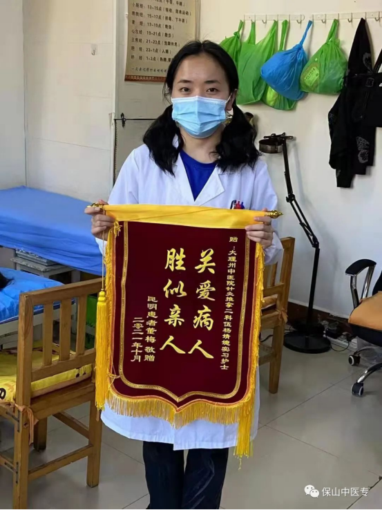 该同学在保山中医专附属大理医院(大理州中医医院)实习,在实习期间该同学充分利用专业知识为病人减轻疾苦,在日常工作中关心、爱护病人,纷纷收到来自昆明、大理的患者赠送的锦旗。