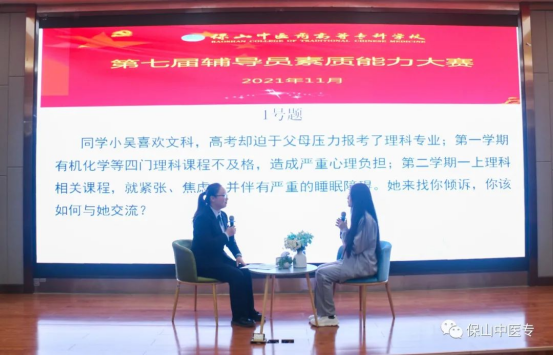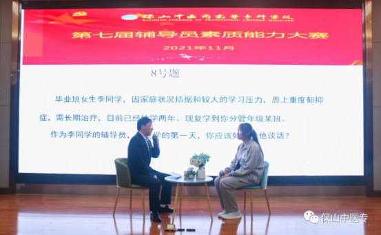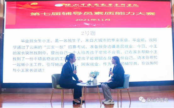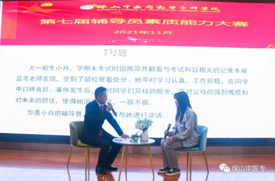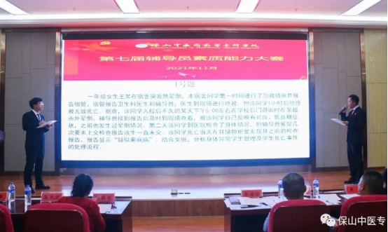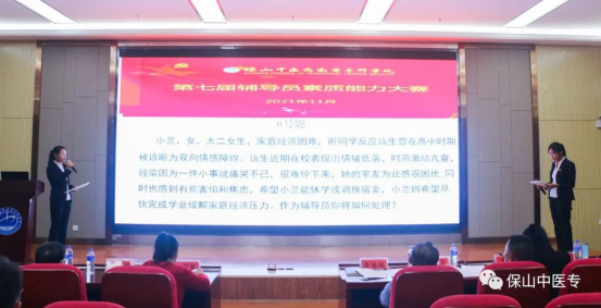 为全面贯彻落实全国全省高校思想政治工作会议精神和十九届二中、三中、四中、五中、六中全会精神,进一步加强辅导员队伍专业化和职业化建设,引导广大辅导员坚定职业理想,明确岗位要求,全面提升辅导员队伍的思政育人质量,11月25日晚,保山中医专第七届辅导员素质能力大赛落下帷幕。