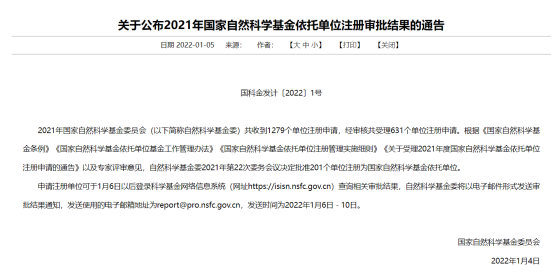1月5日,国家自然科学基金委员会网站发布通告——《关于公布2021年国家自然科学基金依托单位注册审批结果的通告》(国科金发计〔2022〕1号)及邮件通知,保山中医专获批准成为国家自然科学基金依托单位。