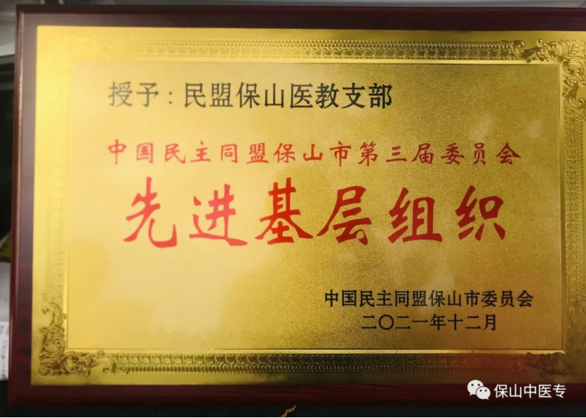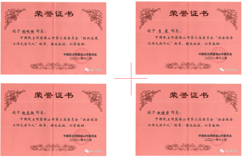 近日,中国民主同盟保山市第三届委员会对届期以来成绩突出的先进基层组织和在参政议政、思想政治建设和宣传、组织发展、社会服务工作中成绩突出的先进个人给予表彰。保山中医专4名盟员获表彰,其中张咏梅老师获“组织发展工作先进个人”称号,同时被推选为中国民主同盟保山市第四届委员会委员;李筱、赵志敏和赵健荣3名老师分别获“社会服务工作先进个人”称号;4名盟员所在的民盟保山医教支部被评为“先进基层组织”。
