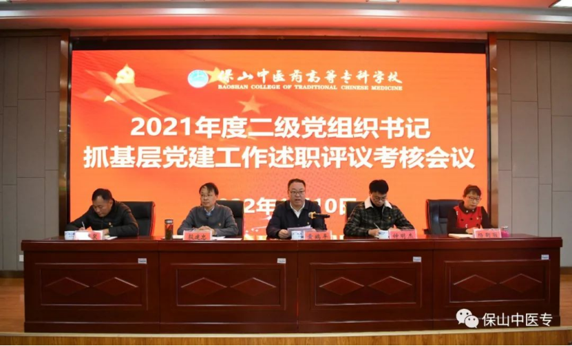 1月10日上午,保山中医专召开党委扩大会议,开展2021年度二级党组织书记抓基层党建工作述职评议考核。会议由党委书记黄鹤平主持。邀请市委组织部党员教育中心主任钟明杰同志到会指导。
