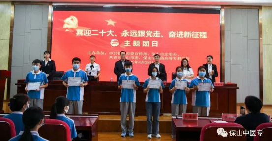 活动中,集中表彰了保山中医专2021年度“优秀共青团员”“优秀共青团干部”“优秀团务工作者”“红旗团支部”“红旗团总支”,保山市创建文明城市志愿服务“优秀志愿者”,“网上重走长征路”暨“四史”学习教育竞答“学习达人”。杨峥宣读表彰决定,中医学院(中药学院)李科毅代表受表彰同学发言。