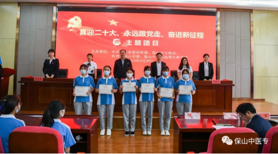 为贯彻落实习近平总书记关于青年工作的重要思想和考察中国人民大学重要讲话精神,纪念“五四”运动103周年暨中国共青团成立100周年,激励广大团员青年建功新时代、奋进新征程。4月28日,中共保山市委宣传部、市文明办、共青团保山市委、保山中医专联合举办“喜迎二十大、永远跟党走、奋进新征程”主题团日线上线下活动,市文明办专职副书记段显洪,学校党委书记黄鹤平,党委副书记杨朝丽,党委委员、副校长杨峥出席活动,活动由杨朝丽主持。