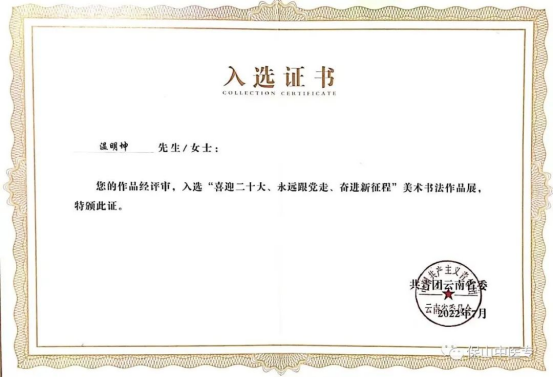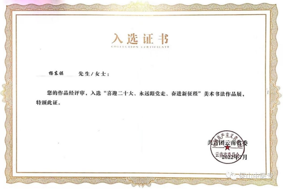 为迎接党的二十大胜利召开,庆祝中国共青团成立100 周年,展现党领导下云南青年运动的百年历程,共青团云南省委、云南省文联联合举办“喜迎二十大、永远跟党走、奋进新征程”书画作品展,保山中医专两名学生的作品入选。