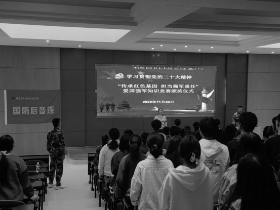 为深入学习宣传贯彻党的二十大精神,深入普及国防教育,弘扬爱国主义精神,推动我校全民国防教育知识宣传普及工作,11月24日,以“传承红色基因 担当强军重任”为主题的爱国强军知识竞赛活动落下帷幕。
