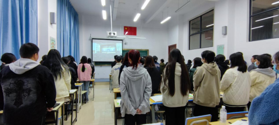 在图书馆报告厅,学校领导班子成员、副科以上干部、教师集中收听收看追悼大会直播。教室内,各班级同学由班主任组织集体收看追悼大会直播。