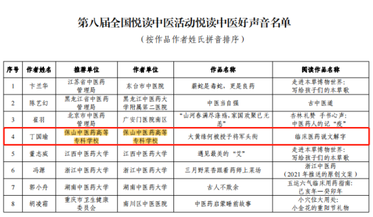 近期,第八届全国悦读中医活动成绩公布,保山中医专在活动中喜获佳绩,丁国瑜老师的《大黄缘何被授予将军头衔》获得悦读中医好声音奖,中医学院2020级中医1班唐钰坚同学的《阅“兔”有感》获得悦读中医好感悟奖,学校获“第八届全国悦读中医活动优秀成员单位”。
