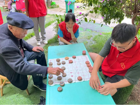 志愿服务团成员走进红庙祥和养老院,为老人送上爱心慰问品,关心他们的日常生活和身体健康情况,倾听老人心声,帮助缓解他们孤独情绪;陪老人下象棋、为老人们推轮椅、剪指甲,让他们感受陪伴的温暖;对于有听力障碍的老年人,志愿者手把手进行手机操作指导,与老人一起分享有趣的视频,共同享受欢快愉悦的时光。