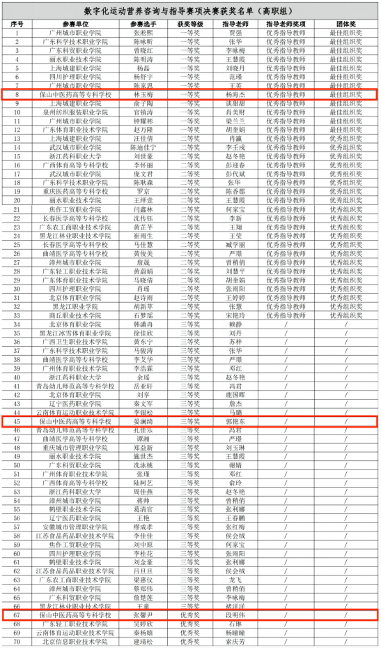 据悉,本项赛事以数字化职业技能竞赛模式为主,共吸引来自全国23个省、自治区、直辖市的196支队伍参赛,其中高职111支,职工58支,中职27支。比赛以数字化技能应用为导向,分理论赛、方案赛、技能赛三项赛程,紧密围绕运动营养产业发展需求设计竞赛内容,综合考察参赛选手专业知识、创新能力和技术应用能力。经过为期4天的激烈角逐,保山中医专基础医学院学生林玉梅荣获高职组一等奖、晏澜绮荣获高职组三等奖、张馨尹荣获高职组优秀奖;教师杨海杰荣获高职组优秀指导教师、学校荣获团体最佳组织奖。