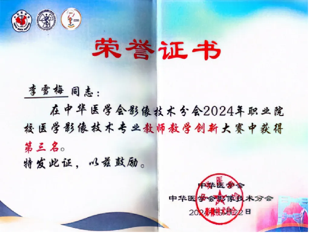 近日,2024 年职业院校大学生实践技能大赛暨医学影像技术专业教师教学创新大赛圆满落幕,学校临床医学院影像专业教师李雪梅荣获三等奖。