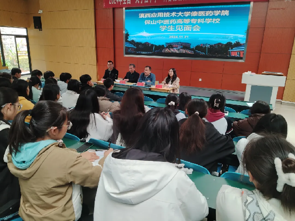 中药学专业高本贯通学生见面会上,贺磊详细介绍了滇西应用技术大学傣医药学院的基本情况,中药学系负责人、中药学专业带头人台海川深入解读了人才培养方案,使学生对未来的学业规划有了更为清晰的认识;教务科科长张雪飞介绍了实用高效的学习方法,对同学们的职业生涯规划作了指导。