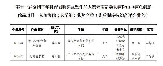 近日,第十一届全国青年科普创新实验暨作品大赛(保山赛区初赛)获奖名单公布,学校教师杨朔指导的学生团队荣获一等奖,教师茶婉月和李东亮指导的学生团队荣获二等奖。