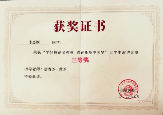 7月15日,由国家民委主办,教育部和共青团中央协办,中央民族大学承办的“学好概论金教材 青春托举中国梦”大学生主题演讲比赛圆满落幕,学校2024级临床4班李思颖同学荣获专科院校组决赛三等奖。