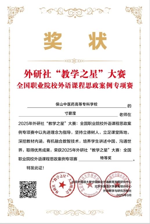9月9日,外研社“教学之星”大赛全国职业院校外语课程思政案例专项赛获奖名单公布,学校教师寸碧滢荣获全国特等奖。