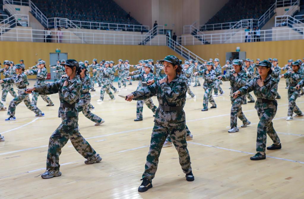 同学们展示了匕首操、警棍术、刺杀、擒敌拳,他们娴熟的动作,饱满的精神,展现出新时代青年学子昂扬向上的精神风貌和军事训练的优秀成果。学生代表王炎发言,分享了军训收获与感悟,表达了对教官和老师的感激之情并表示,将把在军训中养成的好作风、好习惯带到今后的学习生活中,以钢铁般的意志,攀登医学知识的高峰,以团结协作的精神,共同营造优良的学风,为传承创新发展中医药事业、守护人民健康贡献力量。