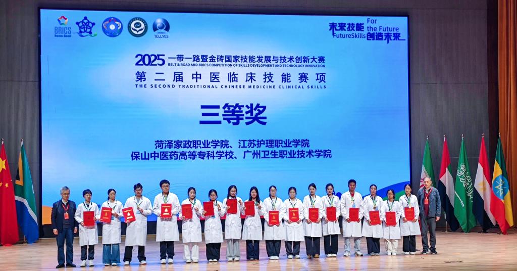 近日,2025一带一路暨金砖国家技能发展与技术创新大赛第二届中医临床技能赛项圆满落幕。学校中医学院学生陈东妹、邵仁宗、杨慧娟、龚自玉团队荣获三等奖。