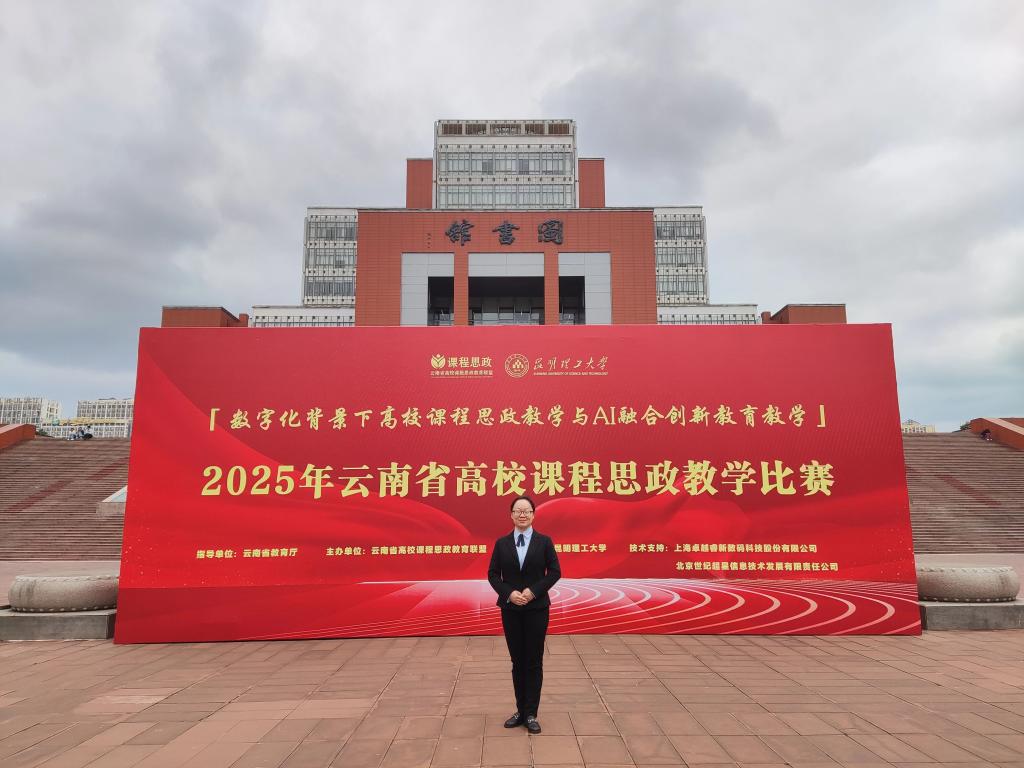 近日,由云南省教育厅指导、云南省高校课程思政教育联盟主办、昆明理工大学承办的2025年云南省高校课程思政教学比赛现场决赛圆满落幕。学校教师杨璧榕凭借扎实的教学功底和精彩的现场表现在激烈角逐中脱颖而出,荣获三等奖。