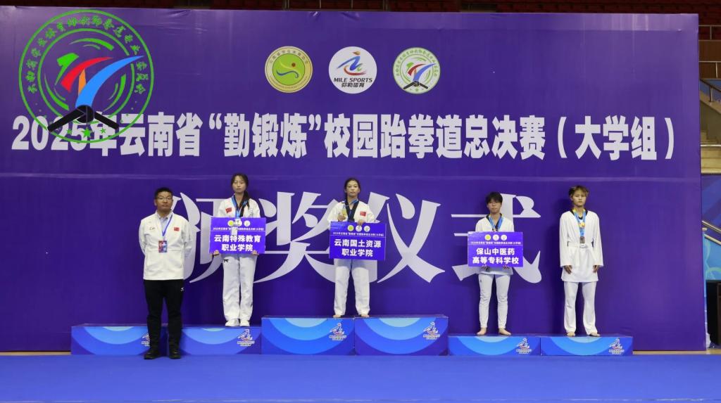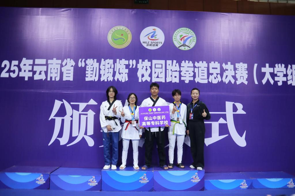 近日,由云南省教育厅主办,弥勒市教育体育局承办的2025年云南省“勤锻炼”校园跆拳道总决赛(大学组)圆满落幕。学校2024级针推1班李彬获男子乙组铜牌,2025级中医2班胡继粉获女子乙组铜牌,2024级临床5班缪素婕获女子乙组第五名。