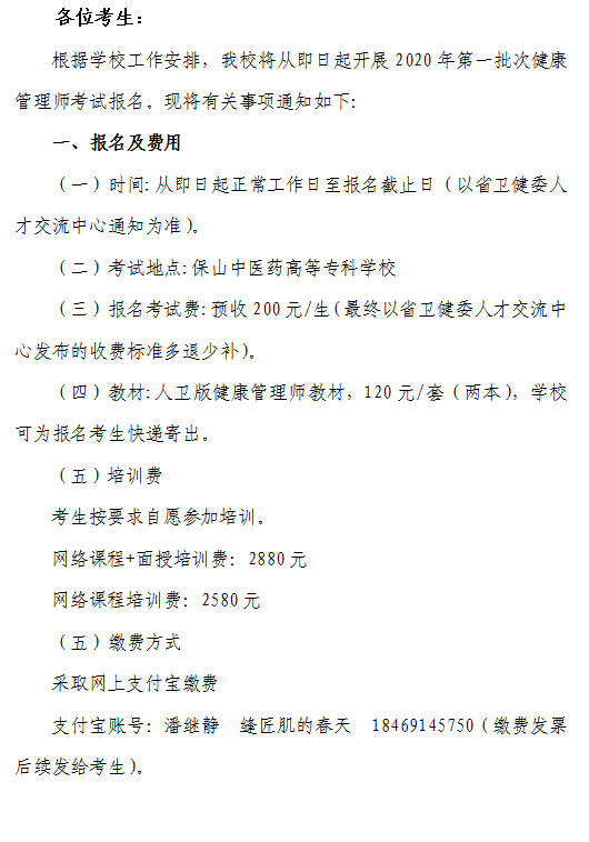 保山中医药高等专科学校2020年第一批次健康管理师报名考试的通知