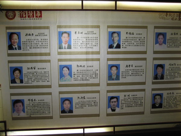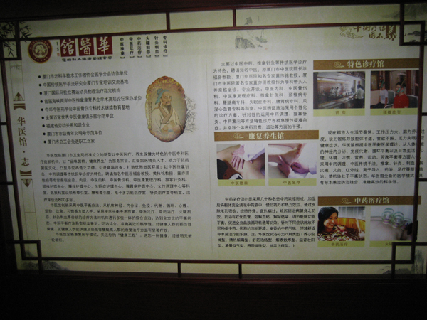 厦门华医馆位于厦门市湖滨南路(长途汽车站旁)繁华地段,营业面积近5000平方米,引进高端设备,打造优雅环境;是市卫生局批准的新型的中医专科连锁医疗机构。2005年被国家中医药学会评为全国医疗行业诚信单位、全国传统中医药知名品牌单位、卫生部卫生人员技能培训厦门培训站协作单位、厦门市老科协医学分会协作单位、厦门国际马拉松赛运动员物理理疗指定单位、中国传统医学手法研究会厦门培训交流基地、2007年第十四届中国传统医学手法学术会承办单位。主要以中医中药推拿针灸等传统医学诊疗为特色,聘请知名中医涂福音教授,黄伟铭教授,张永树教授亲临坐诊。内设:急诊科、中医内科、中医骨伤、中医康复、理疗科、推拿针灸可、颈椎病专科、腰腿痛专科、失眠症专科、脾胃专科、风湿、心血管专科等科室。医技科室:颈椎牵引室、腰椎牵引室、电子多功能治疗室、光波治疗室、中西药房、康复推拿治疗室、针灸治疗室等科室,治疗床位达300多张。