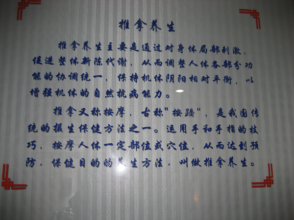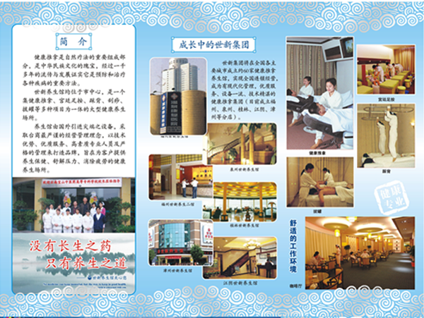 世新养生馆均位于市中心,是一个集健康推拿、宫廷足按、踩背、刮痧、拔罐等多种项目为一体的大型健康养生场所。养生馆由国外引进尖端设备,采取台商最严谨的经营管理理念,以技术优势、优质服务、高素质专业人员及严格的管理来打造品牌,旨在为客户提供养生保健、纾解压力、消除疲劳的健康养生场所。