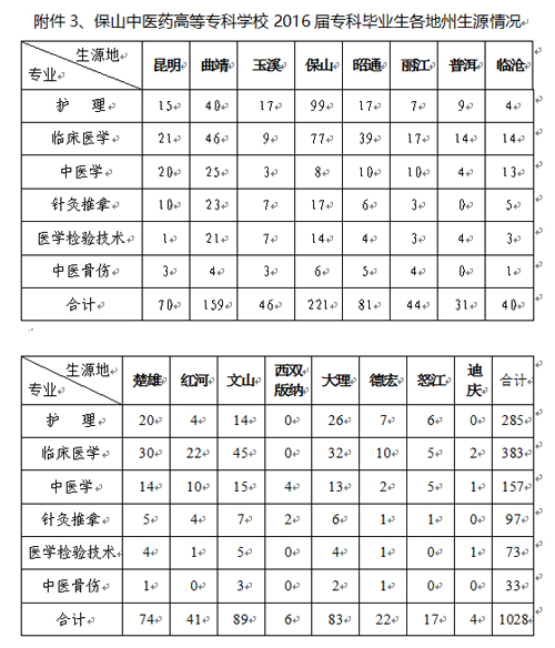 3、保山中医专2016届专科毕业生各地州生源情况; 【下载】