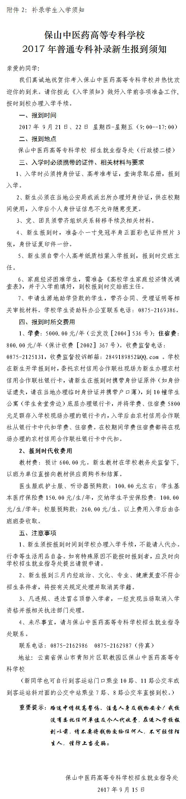 保山中医高等专科学校2017年专科补录名单及补录专业(第一批)已确定,请被录取的同学按照专科补录入学须知及时到保山中医药高等专科学校报到注册并办理相关入学手续。