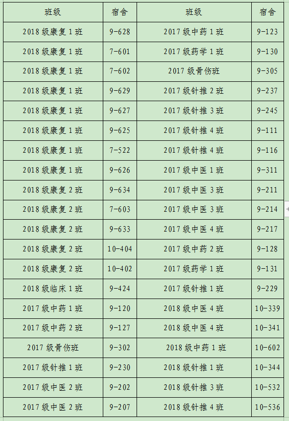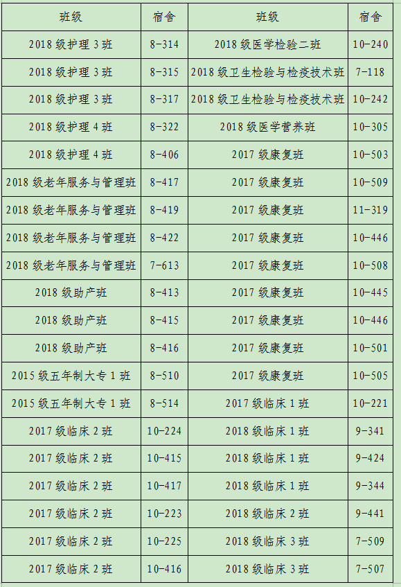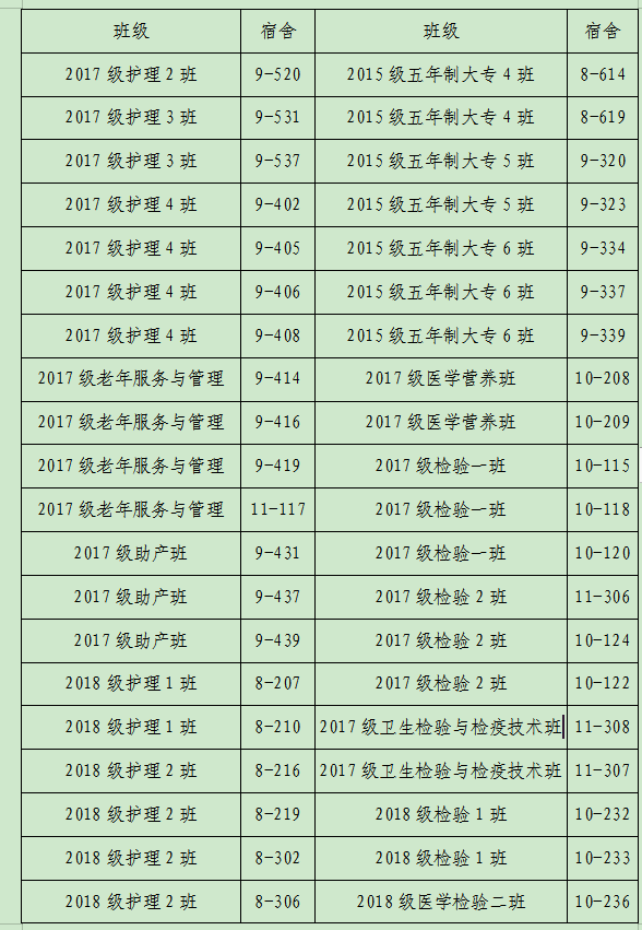 2017级护理1班、2017级护理4班、2018级护理2班、2017级临床3班、2017级影像班、2017级医学营养班、2017级中医3班、2017级针推2班、2017级针推4班、2017级中药2班。