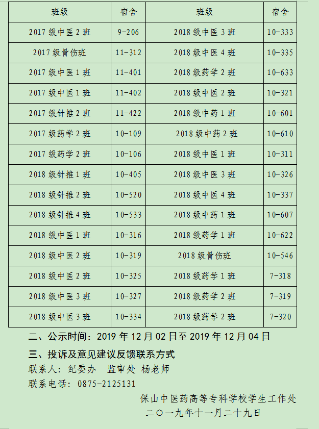 为进一步加强我校学生管理,积极推进校风学风建设,学生处按照学生手册《保山中医药高等专科学校学生“平安班级及平安宿舍评比办法”》的要求,对我校2019年3月至2019年7月学期在校各班级、宿舍进行考评,通过名额测算分配、成绩考核,现将评比结果公示如下。