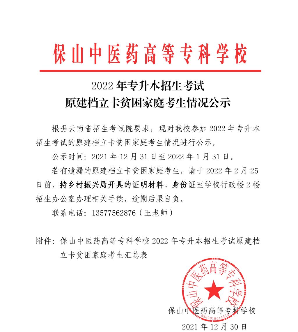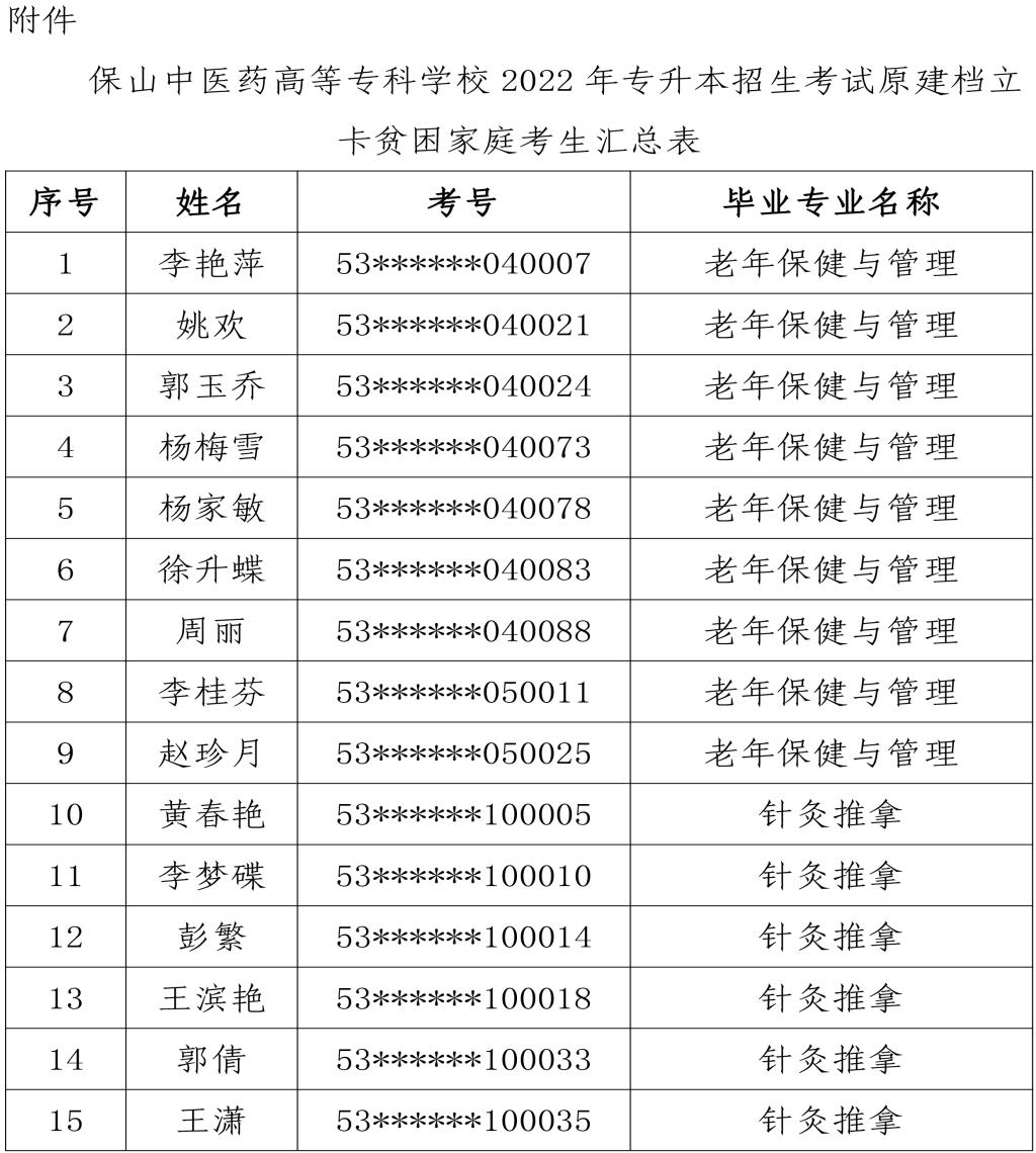 保山中医药高等专科学校2022年专升本招生考试原建档立卡贫困家庭考生情况公示