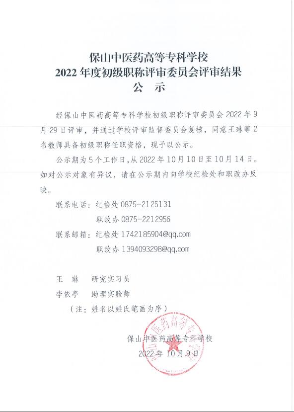 保山中医药高等专科学校2022年度初级职称评审委员会评审结果公示