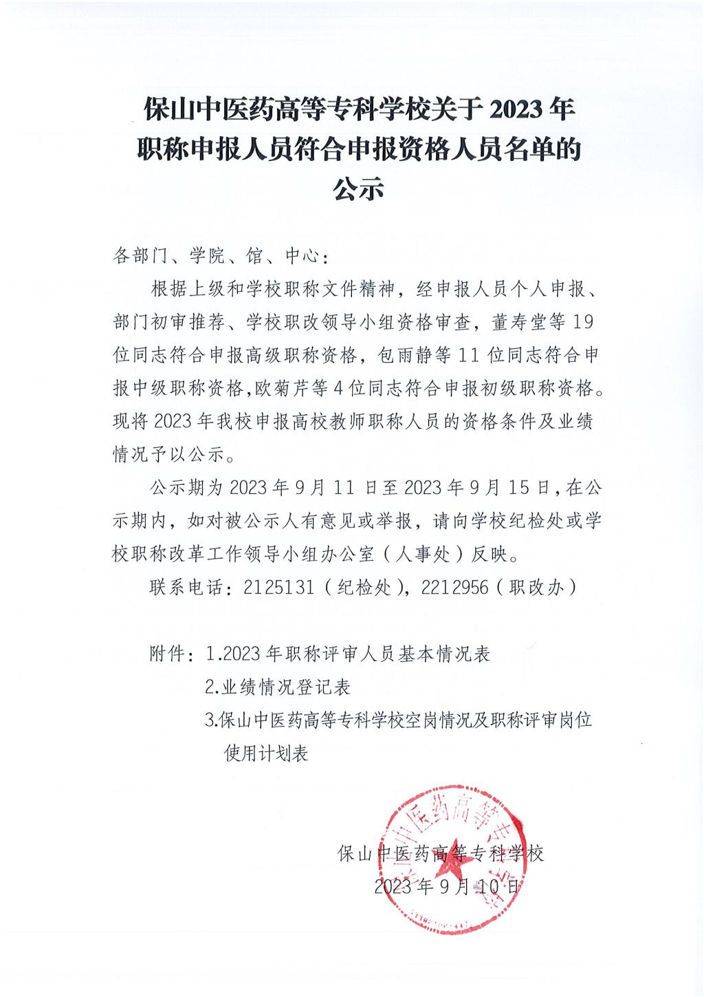 保山中医专关于2023年职称申报人员符合职称申报资格人员名单的公示
