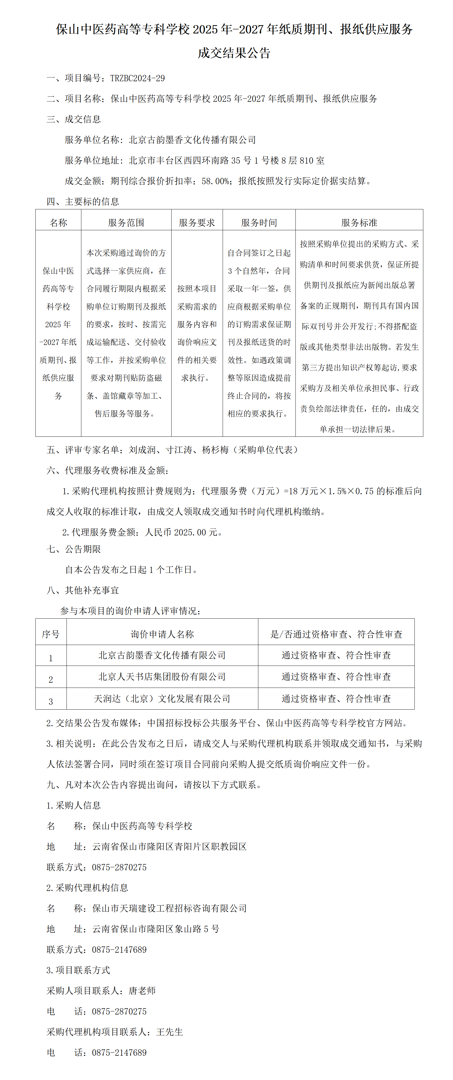 保山中医药高等专科学校2025年-2027年纸质期刊、报纸供应服务成交结果公告