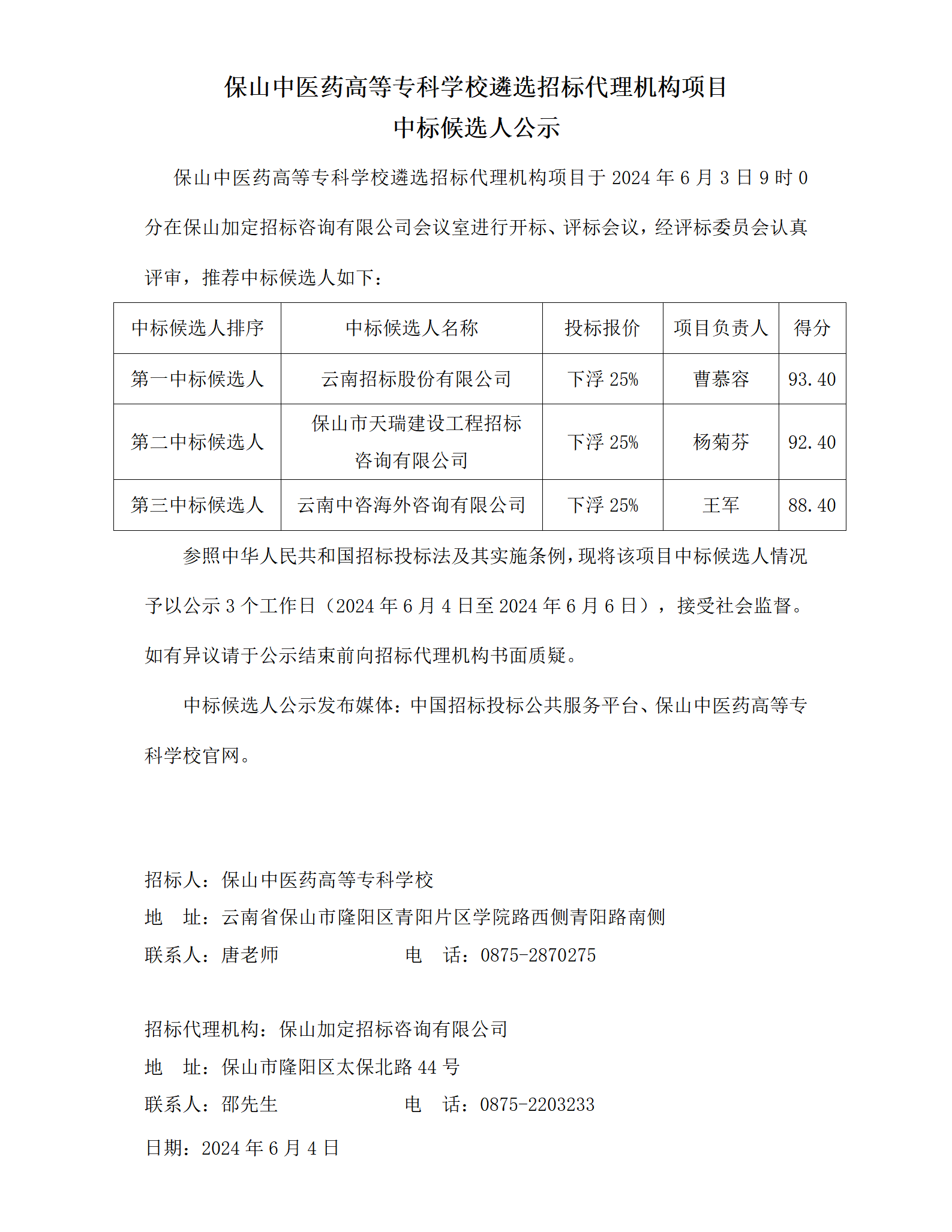保山中医药高等专科学校遴选招标代理机构项目中标候选人公示