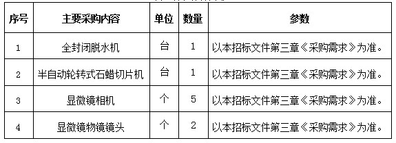 5.1采购内容:采购清单内涉及的各类设备的采购、运输配送、安装调试、检验验收、技术培训指导及售后服务等。本项目核心产品为全封闭脱水机、半自动轮转式石蜡切片机。