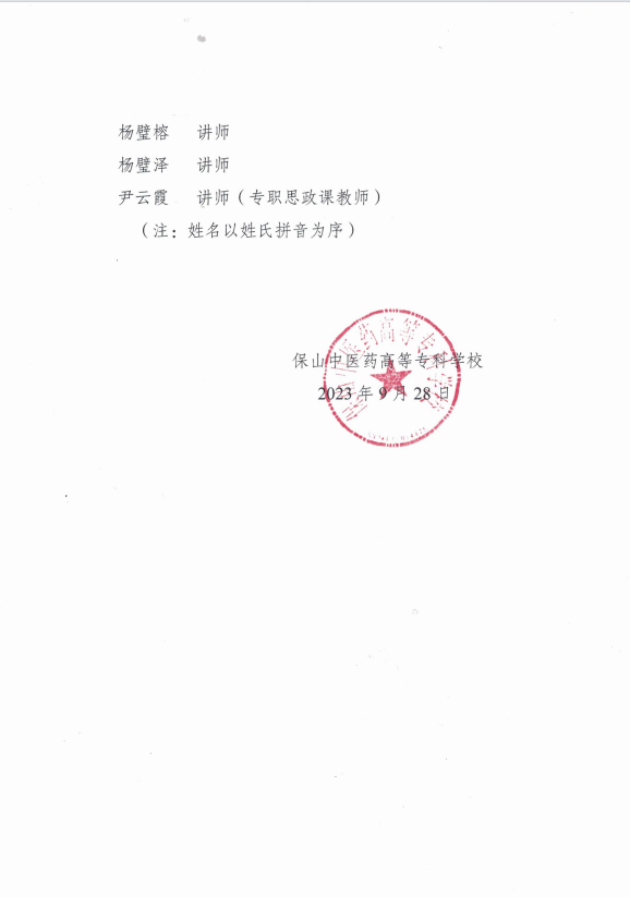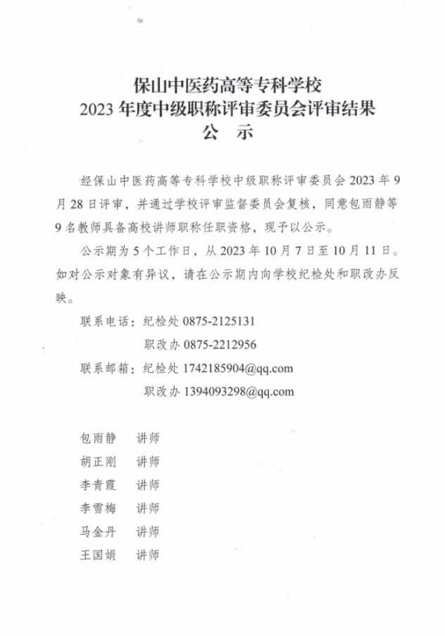 保山中医药高等专科学校2023年度中级职称评审委员会评审结果公示